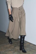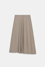 طراحی میانی کمر (mid-waist) به خلق تناسبی جذاب میانجامد و ترکیب پلیسههای ملایم، هِم نامتقارن (asymmetric hem) و جلوِ قابل تنظیم با قفل فلزی (adjustable front fastening with metal buckle) جلوهای خاص و منحصر به فرد به آن بخشیده است. جنس بهکار رفته شامل ۲۴٪ ویسکوز یارن است که به لطافت و جریانپذیری پارچه کمک میکند. رنگ Mink این مدل، طیفی خنثی و شیک دارد که بهراحتی با لباسهای دیگر ست میشود.
