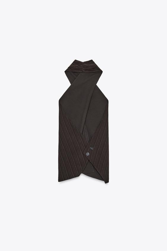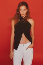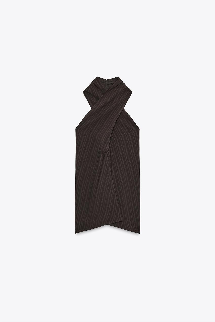 تاپ زنانه زارا با یقهی هالتر و طراحی ضربدری در جلو، انتخابی چشمنواز برای استایلهای خاص و تابستانی.