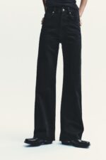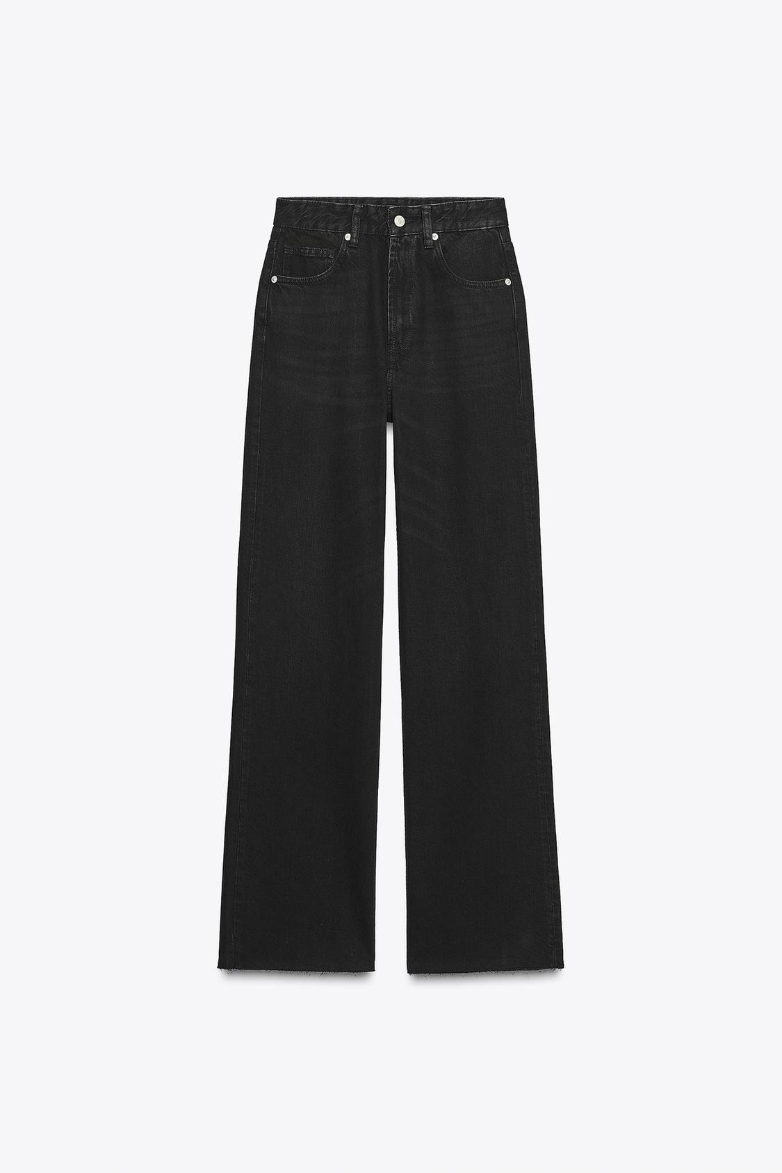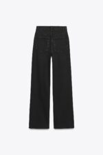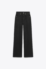 شلوار جین با قامت بلند و فاق بالا از ZARA مدل TRF، با پاچههای خیلی گشاد و طراحی پنججیب کلاسیک، رنگ مشکی خالص و بستهشدن زیپ و دکمه فلزی. مناسب برای استایلهای خیابانی یا رسمیتر با کتانی سفید و کت کوتاه. انتخابی مدرن برای ایجاد تناسب و طول بیشتر در پاها.