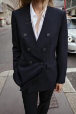 این بلِیزر دارای شانههای کمی پددار برای ساختار بیشتر، دو جیب جلو با درپوش، دو ردیف دکمه در جلو و شکاف پشت برای حرکت راحتتر است.