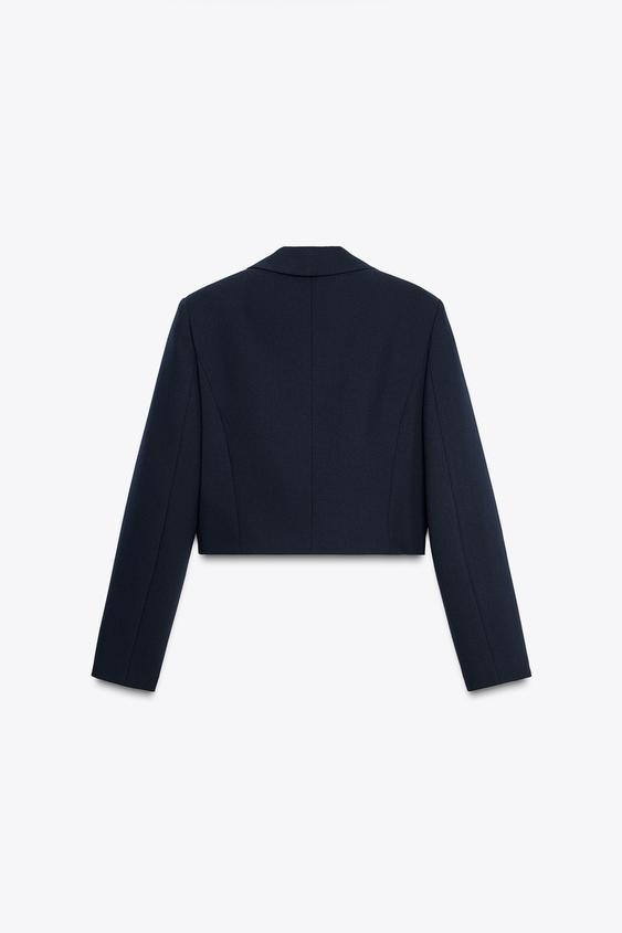 کت بلیزر کوتاه با یقه برگردان، دارای آستین های بلند و پد شانه ای.